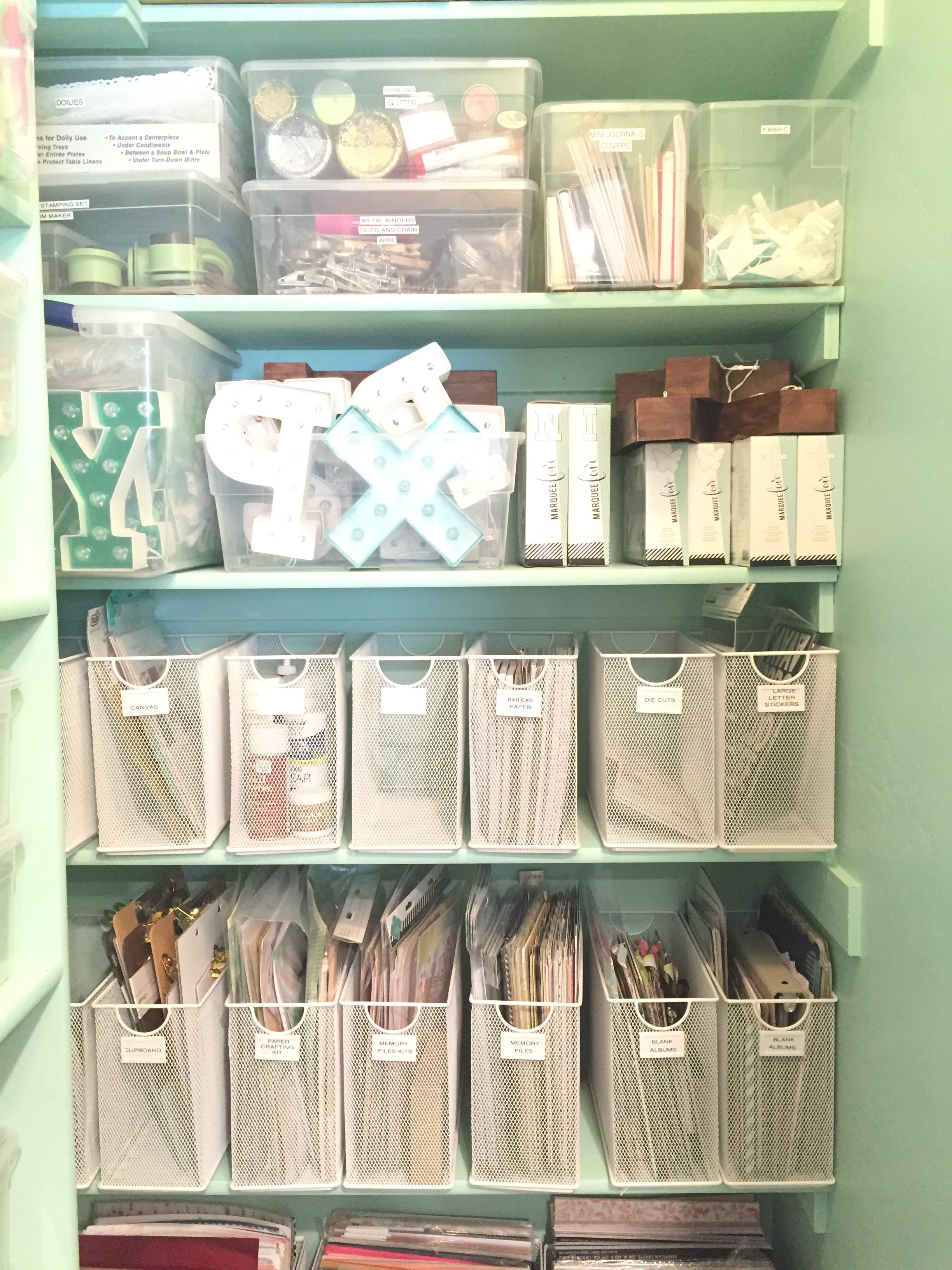Filing containers come in a ton of colors and materials. I love my Lucite ones from Target with mint hanging folders, I use them for all my sheet music. I also used filling containers for this craft closet to hold different projects that are not paper, (go figure) glue, spray paints, and clipboards. Make sure you label each container or box so that you know what is inside. I made these darling labels for my hanging files, by getting cute plastic tags from the Container Store that you can slip in a piece of paper into. Then I wired them onto the file box, sometimes a little extra work makes things so much nicer.