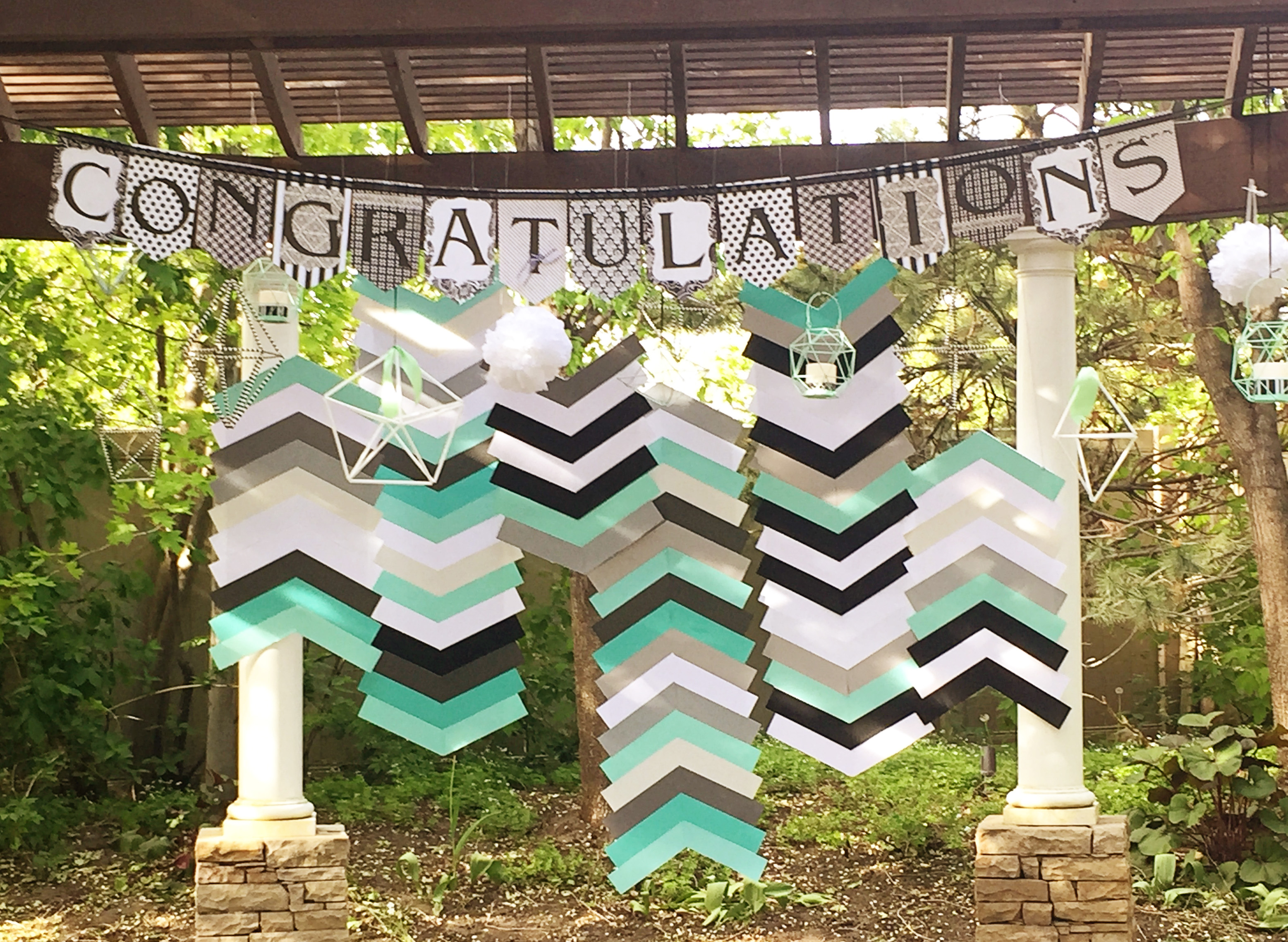 We decided on the herringbone pattern to drape the back of the stage. I had seen this in an anthropology window using stained wood. Gorgeous but hello that was not going to happen. We decided to go with bright colorful paper from My minds eyes new card stock line and wow what an impact. it was supper easy to construct and the cost was so minimal we could have covered the whole room if we wanted too.