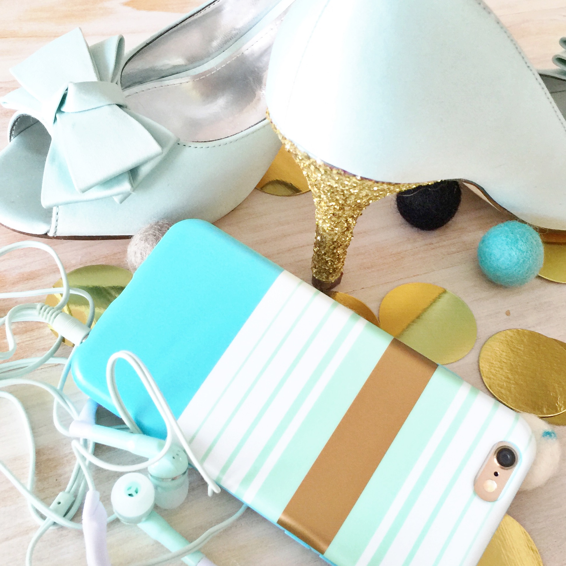 Sprinkle with glitter! I mixed a few kinds of glitter I found that the cut glitter was more sparkly but that the finer (not micro) Martha Stewart glitter got in all the cracks and missed spots. Since the glitter is only on the heels and is very subtle I wanted it to sparkle a lot! You might find that you have to fill in a few spots after they have dried and that’s OK just add a bit more glue and more glitter. remove the tape before the glue dries and leave shoes to dry overnight for this first step.